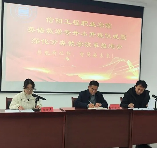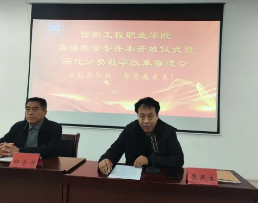 为精准推进教学改革,助力学生多元化发展,3 月 11 日,信阳工程职业学院在鲁班楼一楼阶梯教室隆重举行了高数、英语专升本班开班仪式暨深化分类教学改革推进会。学院副院长杨金国、各系部主任、教务处全体人员以及教师和学生代表共同出席了此次会议,会议由教务处张民生处长主持。