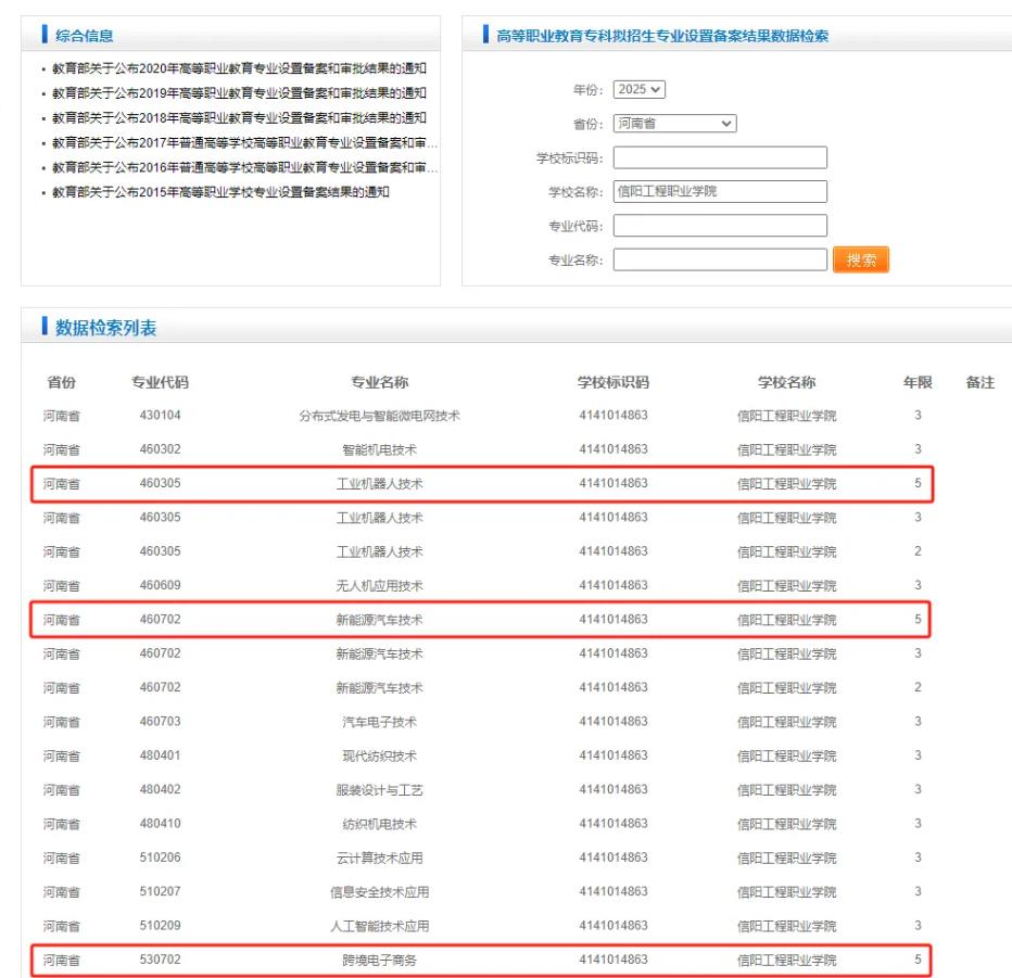 近日,教育部发布了《关于公布2025年高等职业教育专科专业设置备案和审批结果的通知》,公布了2025年高等职业教育专科专业设置备案和审批结果,信阳工程职业学院(招生代码为098)3个“五年一贯制”专业获批,分别是工业机器人技术(专业代码:460305)、新能源汽车技术(专业代码:460702)、跨境电子商务(专业代码:530702)。3个专业在2025年秋季开始招生,每个专业招生计划数100人,合计300人。